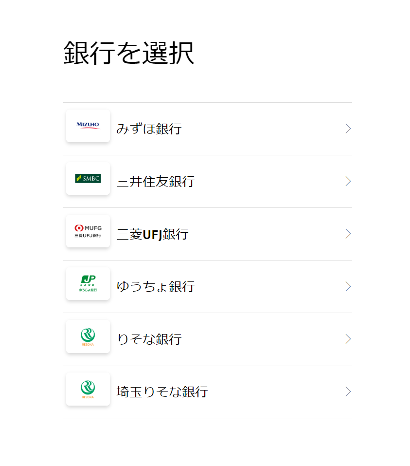 次にお支払いに使用する銀行を選択してください。