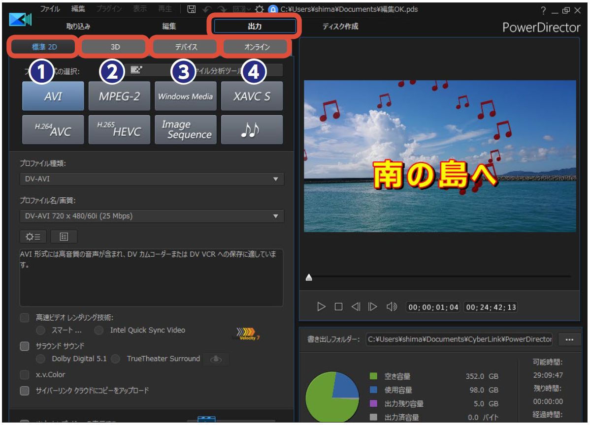 [出力]画面では、編集したビデオを