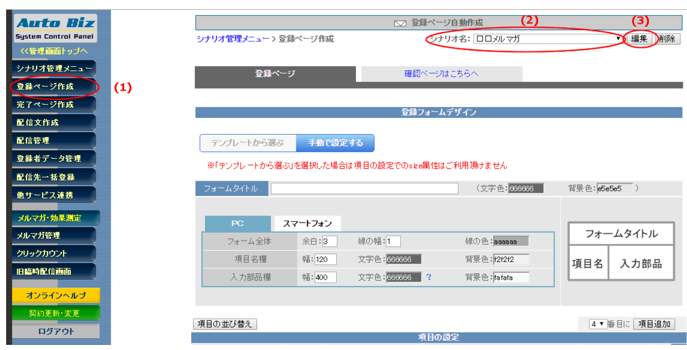 まず左メニューから登録ページ作成を選び