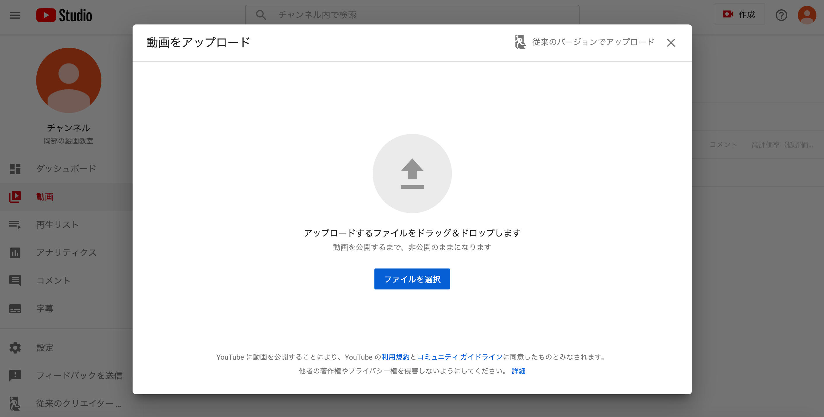 チャンネル画面から動画をアップロードを
