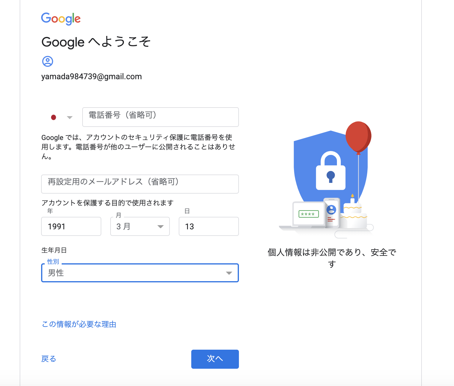 生年月日や性別を入力する場所が