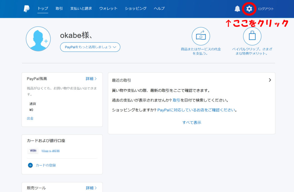 ペイパルにログインしたら画面上の歯車のマークをクリックします。